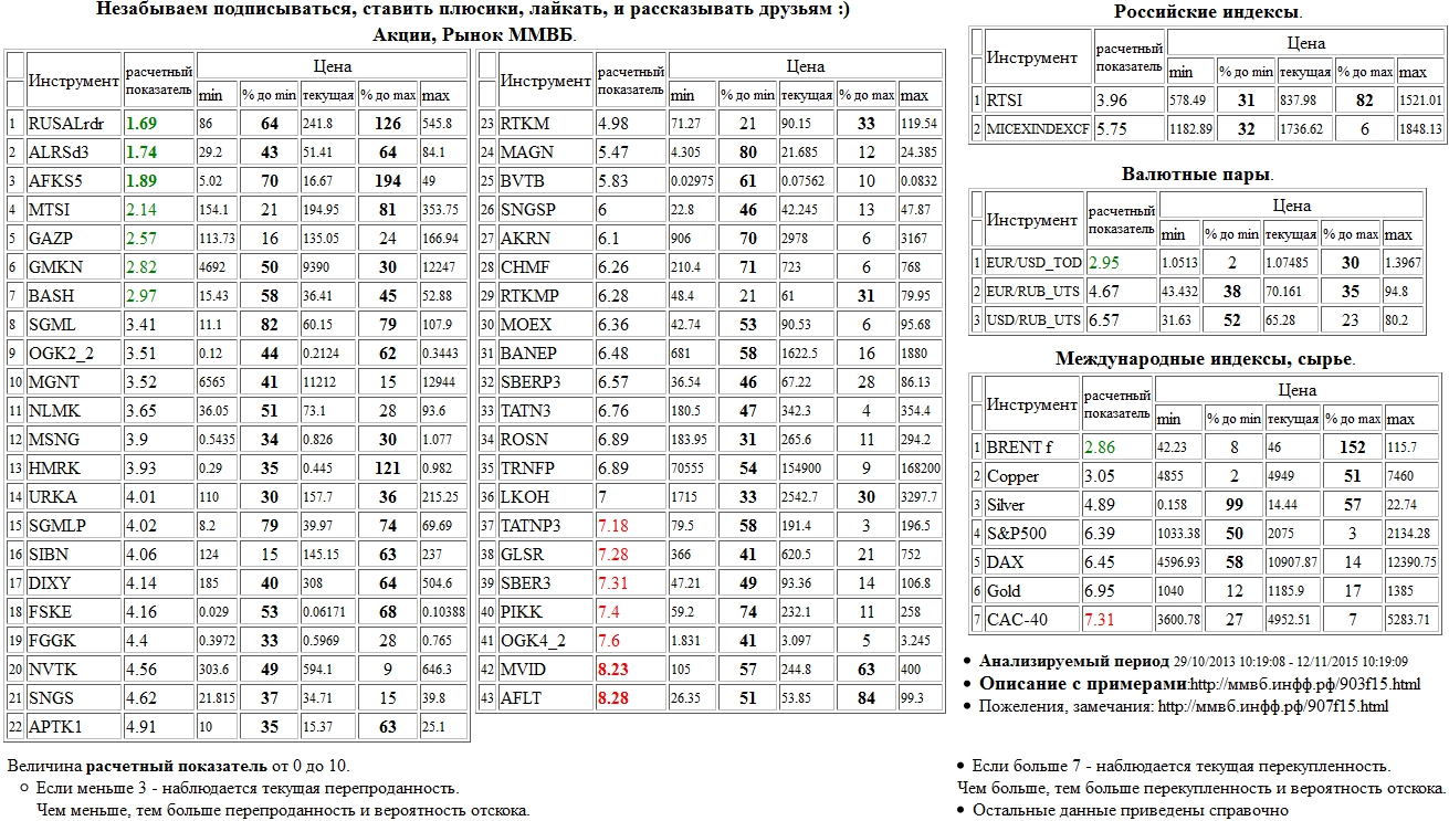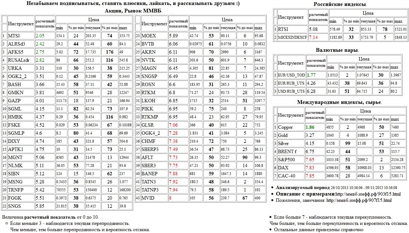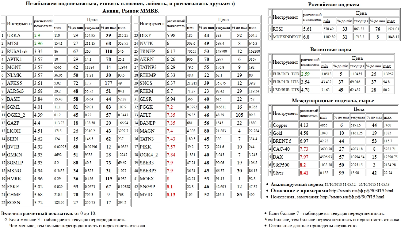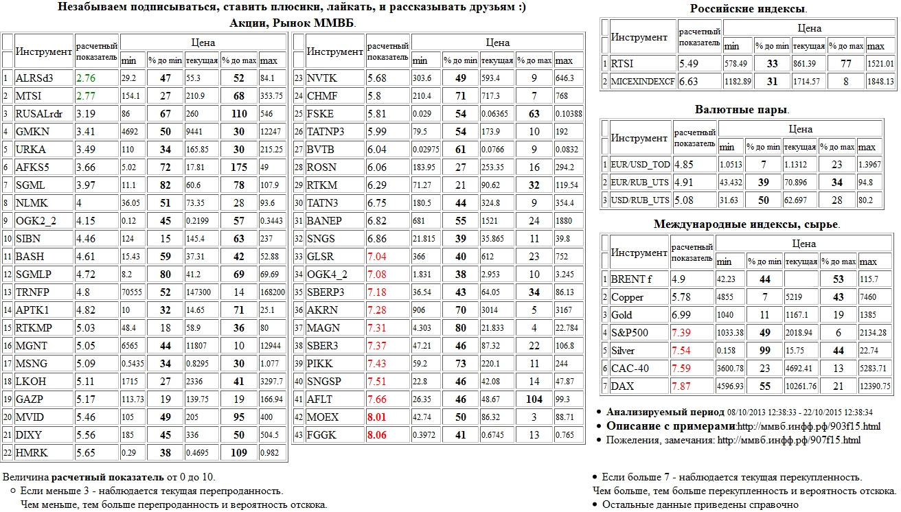 На 22/10/2015 12:37:01 при анализе акций рынка ценных бумаг ммвб, российских и международных индексов и валютных пар, сырья выявлено следующее - > Текущий анализ (архив, данные до 12.4.2016) - > Текущий анализ Сильно перекуплены: Моск. Биржа ММВБ-РТС а.о. ( MOEX )