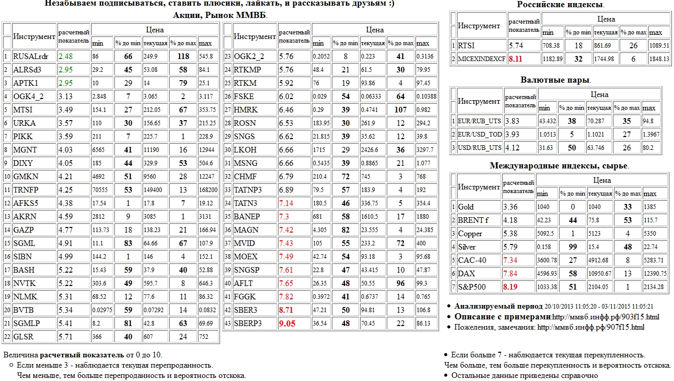На 03/11/2015 11:04:02 при анализе акций рынка ценных бумаг ммвб, российских и международных индексов и валютных пар, сырья выявлено следующее - > Текущий анализ (архив, данные до 12.4.2016) - > Текущий анализ Сильно перекуплены: Сбербанк а.о. 3 в. ( SBER3 ), S&P 500 Index ( S&P500 )