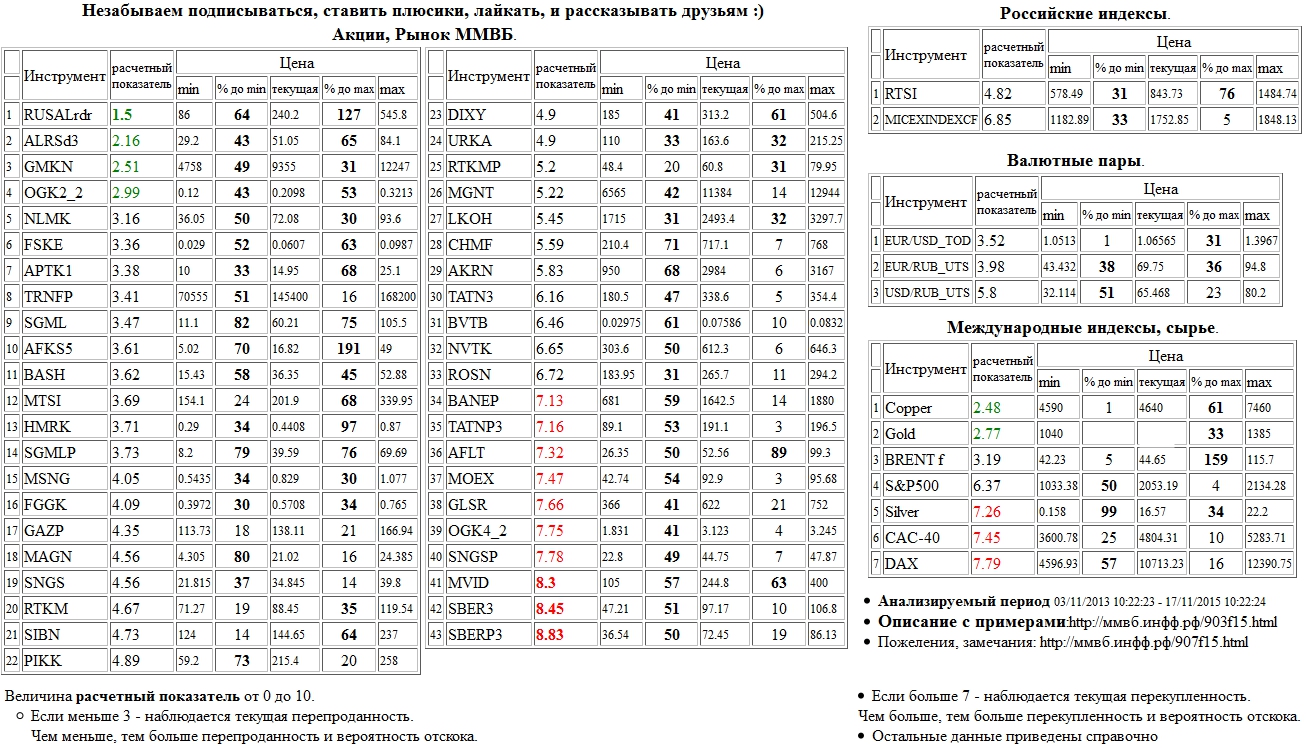 На 19/11/2015 10:35:39 при анализе акций рынка ценных бумаг ммвб, российских и международных индексов и валютных пар, сырья выявлено следующее - > Текущий анализ (архив, данные до 12.4.2016) - > Текущий анализ Сильно перепроданы: RUSAL РДР 1:10 ( RUSALrdr )