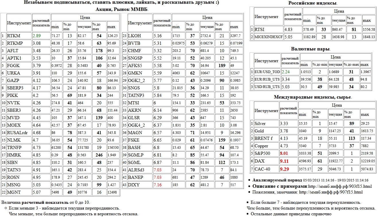На 19/03/2015 11:12:37 при анализе акций рынка ценных бумаг ммвб, российских и международных индексов и валютных пар, сырья выявлено следующее - > Текущий анализ (архив, данные до 12.4.2016)