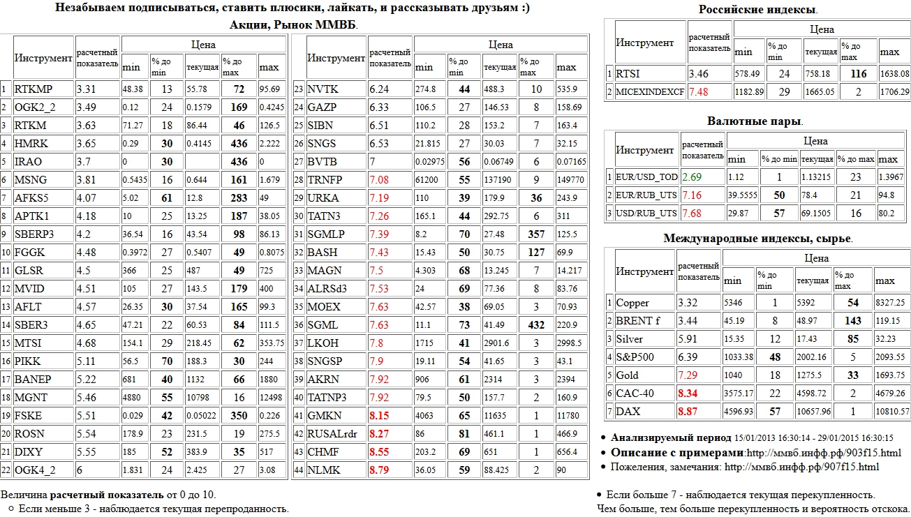На 30/01/2015 14:47:42 при анализе акций рынка ценных бумаг ммвб, российских и международных индексов и валютных пар, сырья выявлено следующее - > Текущий анализ (архив, данные до 12.4.2016) - > Текущий анализ Перекуплены : ВТБ а.о. ( BVTB ), Татнефть а.п. 3 в. ( TATNP3 ), АЛРОСА а.о. 3 в. ( ALRSd3 ), Моск. Биржа ММВБ-РТС а.о. ( MOEX ), Распадская а.о. ( BASH ), Сургутнефтегаз а.п. ( SNGSP ), ГМК НорНикель а.о. ( GMKN ), Евро/Рубль (UTS) ( EUR/RUB_UTS ), Paris CAC-40 Index ( CAC-40 )Сильно перекуплены : Северсталь а.о. ( CHMF ), RUSAL РДР 1:10 ( RUSALrdr ), Акрон а.о. ( AKRN ), НЛМК а.о. ( NLMK ), Xetra DAX Index ( DAX )Перепроданы : РТС Индекс ( RTSI ), EUR/USD_TOD ( EUR/USD_TOD )