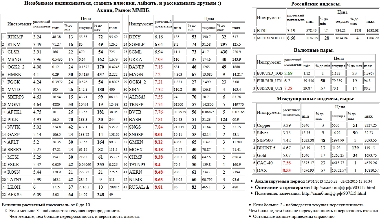На 05/02/2015 13:24:23 при анализе акций рынка ценных бумаг ммвб, российских и международных индексов и валютных пар, сырья выявлено следующее - > Текущий анализ (архив, данные до 12.4.2016) - > Текущий анализ Перекуплены : Уралкалий а.о. ( URKA ), Сургутнефтегаз а.п. ( SNGSP ), Газпром Нефть а.о. ( SIBN ), ВТБ а.о. ( BVTB ), Распадская а.о. ( BASH ), Татнефть а.о. 3 в. ( TATN3 ), АЛРОСА а.о. 3 в. ( ALRSd3 ), Акрон а.о. ( AKRN ), НЛМК а.о. ( NLMK ), Сургутнефтегаз а.о. ( SNGS ), Лукойл а.о. ( LKOH ), ММВБ Индекс акций ( MICEXINDEXCF ), Золото ( Gold ), S&P 500 Index ( S&P500 )Сильно перекуплены : ММК а.о. ( MAGN ), Татнефть а.п. 3 в. ( TATNP3 ), Моск. Биржа ММВБ-РТС а.о. ( MOEX ), Северсталь а.о. ( CHMF ), RUSAL РДР 1:10 ( RUSALrdr ), Paris CAC-40 Index ( CAC-40 )Очень сильно перекуплены : Xetra DAX Index ( DAX )Перепроданы : EUR/USD_TOD ( EUR/USD_TOD )