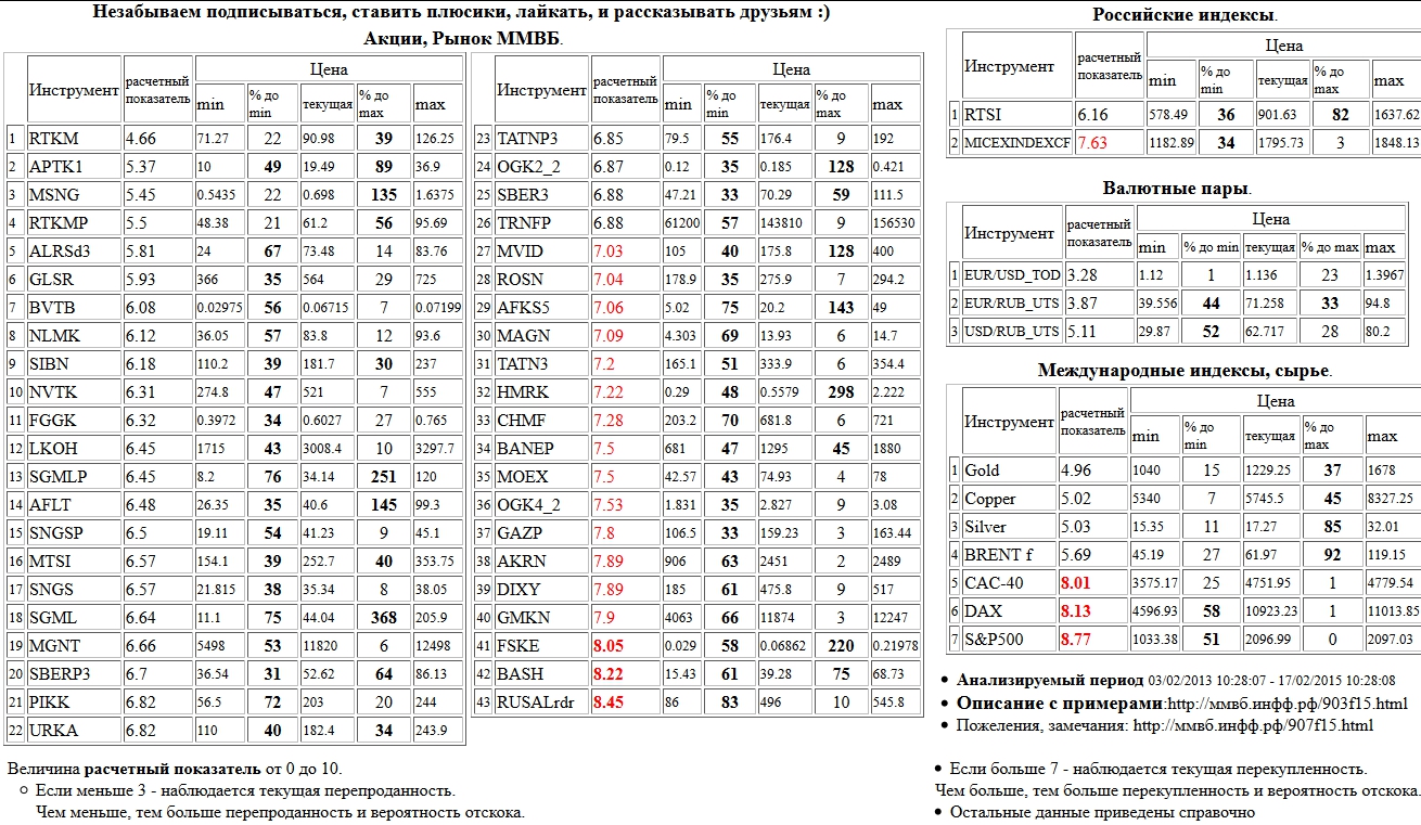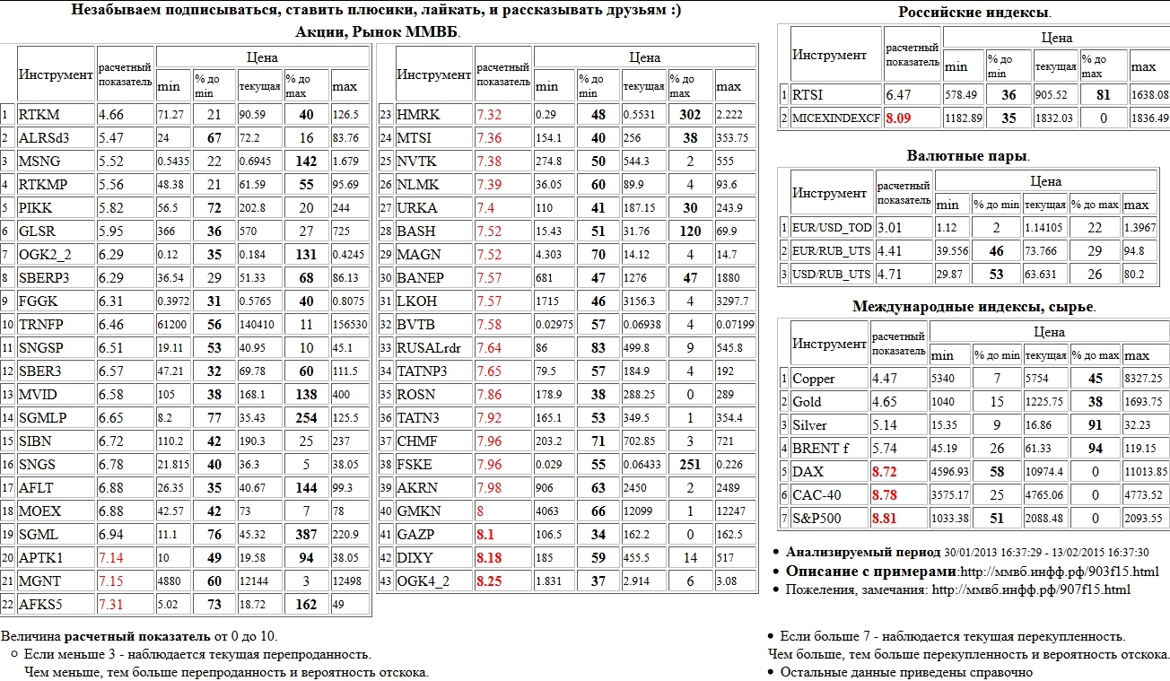 На 13/02/2015 16:35:33 при анализе акций рынка ценных бумаг ммвб, российских и международных индексов и валютных пар, сырья выявлено следующее - > Текущий анализ (архив, данные до 12.4.2016) - > Текущий анализ Сильно перекуплены : Дикси а.о. ( DIXY ), Э.ОН Россия(ОГК-4) а.о. 2 в ( OGK4_2 ), ММВБ Индекс акций ( MICEXINDEXCF ), Xetra DAX Index ( DAX ), Paris CAC-40 Index ( CAC-40 ), S&P 500 Index ( S&P500 )Перекуплены : Магнит а.о. ( MGNT ), Аптека 36,6 а.о. 1 в ( APTK1 ), НОВАТЭК а.о. ( NVTK ), АФК Система а.о. 5 в. ( AFKS5 ), Российские Сети а.о. ( HMRK ), Уралкалий а.о. ( URKA ), МТС а.о. ( MTSI ), НЛМК а.о. ( NLMK ), Лукойл а.о. ( LKOH ), ВТБ а.о. ( BVTB ), ММК а.о. ( MAGN ), Башнефть а.п. ( BANEP ), Распадская а.о. ( BASH ), RUSAL РДР 1:10 ( RUSALrdr ), Татнефть а.п. 3 в. ( TATNP3 ), НК Роснефть а.о. ( ROSN ), Татнефть а.о. 3 в. ( TATN3 ), Северсталь а.о. ( CHMF ), ФСК ЕЭС а.о. ( FSKE ), Акрон а.о. ( AKRN ), Газпром а.о. ( GAZP ), ГМК НорНикель а.о. ( GMKN )