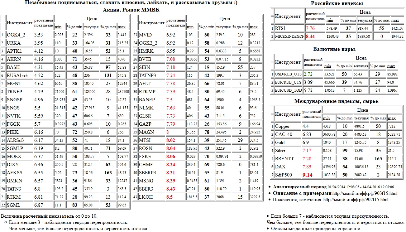 VIDEO финансист Евгений Коган интересный товарищ, размышления о рисках, рубле, кризисе, инвестициях На 30/03/2016 14:35:04 при анализе акций рынка ценных бумаг ммвб, российских и международных индексов и валютных пар, сырья выявлено следующее - > Текущий анализ (архив, данные до 12.4.2016) - > Текущий анализ Очень сильно перекуплены : S&P 500 Index ( S&P500 )Сильно перекуплены : НЛМК а.о. ( NLMK ), Мосэнерго а.о. ( MSNG )Перепроданы : Распадская а.о. ( BASH )Перекуплены : РусГидро а.о. ( FGGK ), Газпром Нефть а.о. ( SIBN ), ОГК-2 а.о. 2 в ( OGK2_2 ), НК Роснефть а.о. ( ROSN ), Ростелеком а.п. ( RTKMP ), Башнефть а.п. ( BANEP ), МТС а.о. ( MTSI ), Сбербанк а.о. 3 в. ( SBER3 ), Ростелеком а.о. ( RTKM ), М Видео а.о. ( MVID ), ФСК ЕЭС а.о. ( FSKE ), Северсталь а.о. ( CHMF ), Сбербанк а.п. 3 в. ( SBERP3 ), Аэрофлот а.о. ( AFLT ), Татнефть а.о. 3 в. ( TATN3 ), ММВБ Индекс акций ( MICEXINDEXCF ), РТС Индекс ( RTSI ), EUR/USD_TOD ( EUR/USD_TOD ), Xetra DAX Index ( DAX )