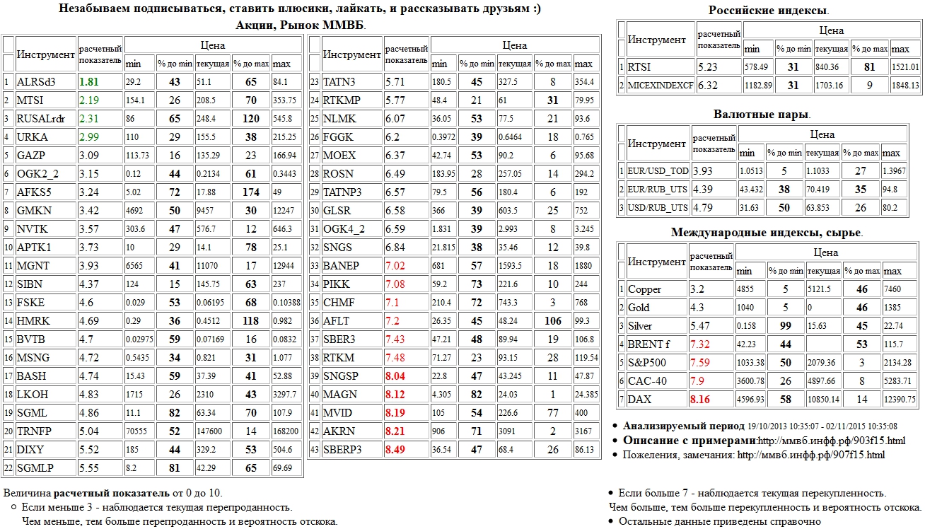 Перекуплены: Лукойл а.о. ( LKOH ), Газпром а.о. ( GAZP ), ВТБ а.о. ( BVTB ), Татнефть а.п. 3 в. ( TATNP3 ), НЛМК а.о. ( NLMK ), Ростелеком а.п. ( RTKMP ), Татнефть а.о. 3 в. ( TATN3 ), Группа ЛСР а.о. ( GLSR ), ММК а.о. ( MAGN ), Моск. Биржа ММВБ-РТС а.о. ( MOEX ), МТС а.о. ( MTSI ), Северсталь а.о. ( CHMF ), ФСК ЕЭС а.о. ( FSKE ), НК Роснефть а.о. ( ROSN ), ММВБ Индекс акций ( MICEXINDEXCF ), EUR/USD_TOD ( EUR/USD_TOD )