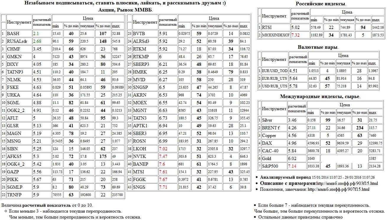 На 29/01/2016 11:05:32 при анализе акций рынка ценных бумаг ммвб, российских и международных индексов и валютных пар, сырья выявлено следующее - > Текущий анализ (архив, данные до 12.4.2016) - > Текущий анализ Перепроданы : Распадская а.о. ( BASH ), RUSAL РДР 1:10 ( RUSALrdr )Перекуплены : НК Роснефть а.о. ( ROSN ), Лукойл а.о. ( LKOH ), НОВАТЭК а.о. ( NVTK ), Башнефть а.п. ( BANEP ), МТС а.о. ( MTSI ), Сургутнефтегаз а.о. ( SNGS ), РусГидро а.о. ( FGGK ), ММВБ Индекс акций ( MICEXINDEXCF ), S&P 500 Index ( S&P500 )