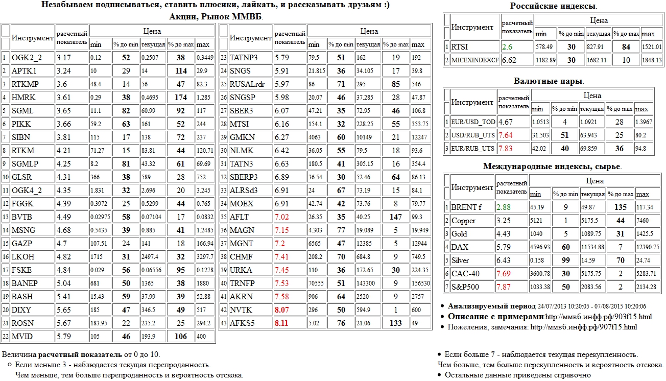 На 07/08/2015 10:19:02 при анализе акций рынка ценных бумаг ммвб, российских и международных индексов и валютных пар, сырья выявлено следующее - > Текущий анализ (архив, данные до 12.4.2016) - > Текущий анализ Сильно перекуплены: АФК Система а.о. 5 в. ( AFKS5 ), НОВАТЭК а.о. ( NVTK )
