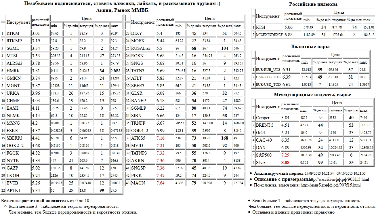 На 09/10/2015 10:20:50 при анализе акций рынка ценных бумаг ммвб, российских и международных индексов и валютных пар, сырья выявлено следующее