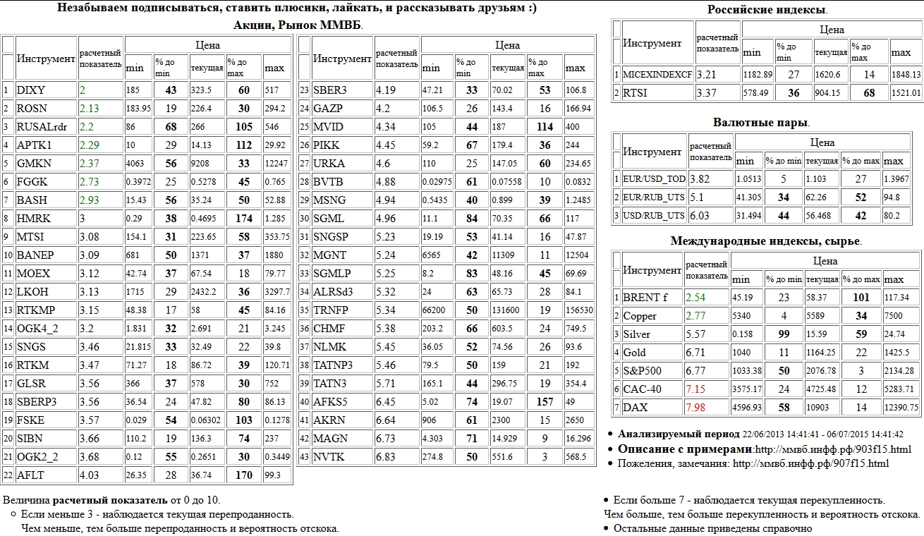 На 15/07/2015 12:06:14 при анализе акций рынка ценных бумаг ммвб, российских и международных индексов и валютных пар, сырья выявлено следующее - > Текущий анализ (архив, данные до 12.4.2016) - > Текущий анализ 06 Сильно перекуплены: ММК а.о. ( MAGN ), НОВАТЭК а.о. ( NVTK ), Xetra DAX Index ( DAX ), S&P 500 Index ( S&P500 )