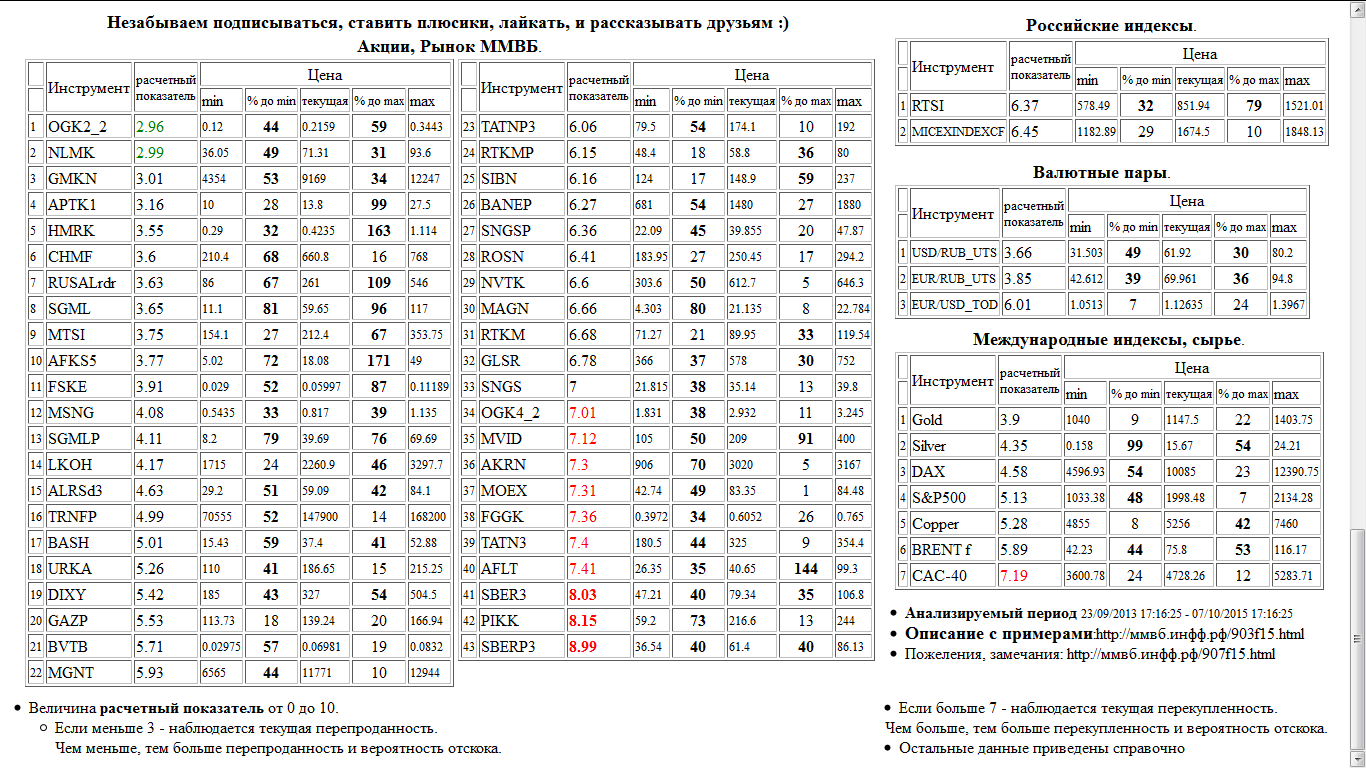 На 07/10/2015 17:15:37 при анализе акций рынка ценных бумаг ммвб, российских и международных индексов и валютных пар, сырья выявлено следующее - > Текущий анализ (архив, данные до 12.4.2016) - > Текущий анализ 17 Сильно перекуплены: Сбербанк а.о. 3 в. ( SBER3 ), Группа ПИК а.о. ( PIKK ), Сбербанк а.п. 3 в. ( SBERP3 )
