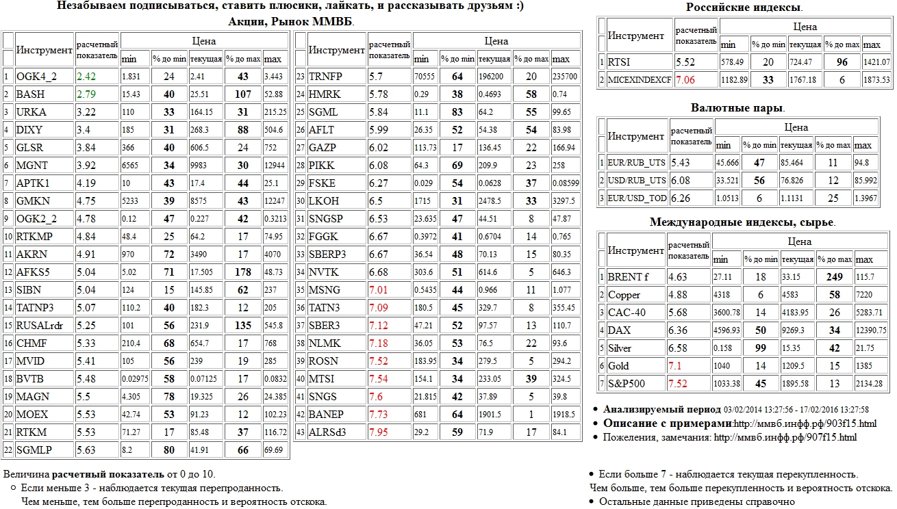 На 17/02/2016 13:26:00 при анализе акций рынка ценных бумаг ммвб, российских и международных индексов и валютных пар, сырья выявлено следующее - > Текущий анализ (архив, данные до 12.4.2016) - > Текущий анализ 26 Перепроданы: Э.ОН Россия(ОГК-4) а.о. 2 в ( OGK4_2 ), Распадская а.о. ( BASH )