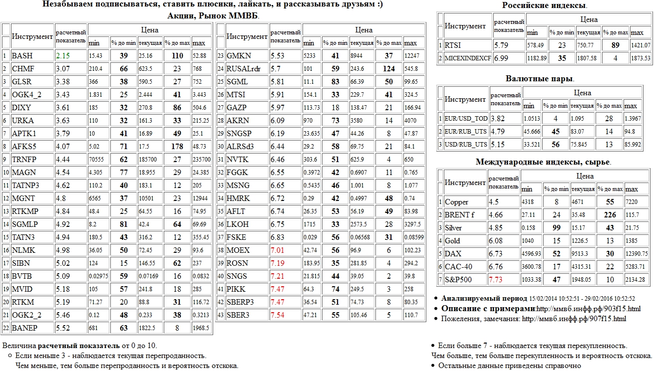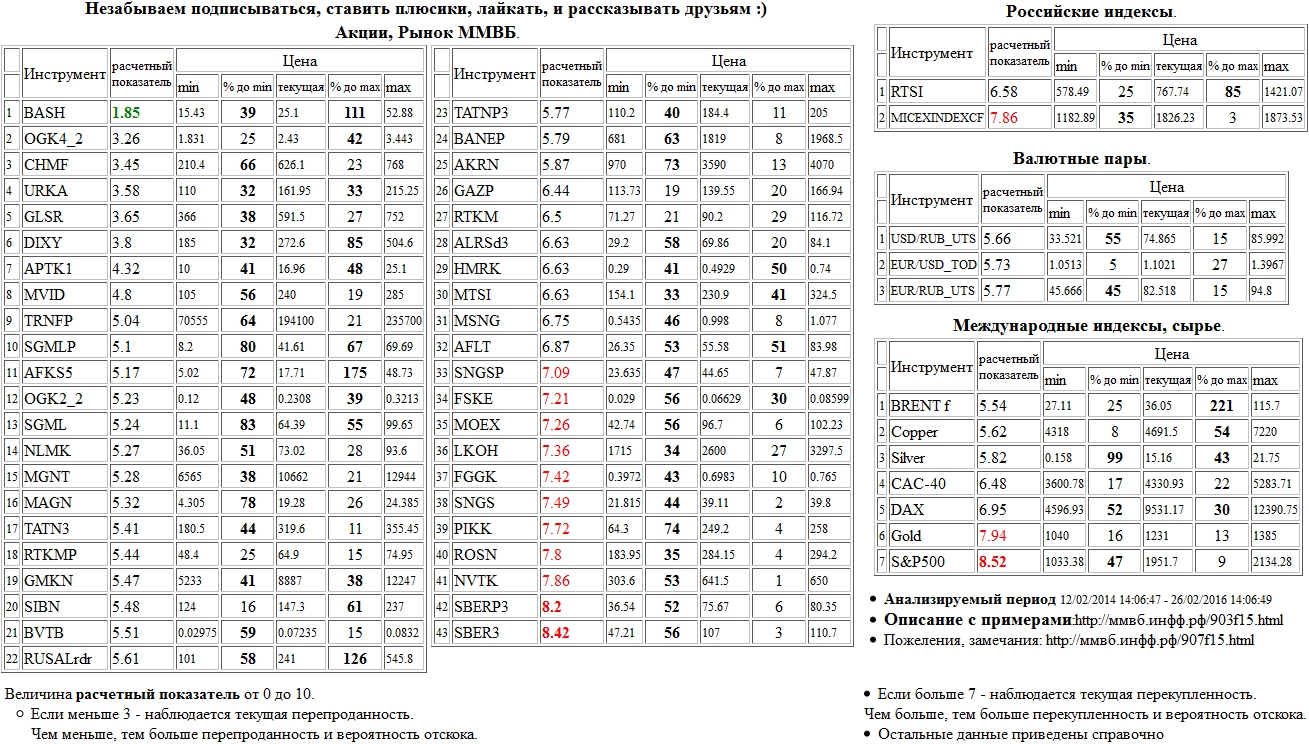 На 26/02/2016 14:04:54 при анализе акций рынка ценных бумаг ммвб, российских и международных индексов и валютных пар, сырья выявлено следующее - > Текущий анализ (архив, данные до 12.4.2016) - > Текущий анализ 26 Сильно перепроданы: Распадская а.о. ( BASH )