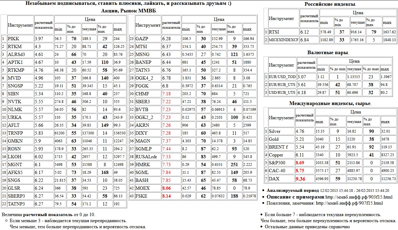 На 17/02/2015 10:26:14 при анализе акций рынка ценных бумаг ммвб, российских и международных индексов и валютных пар, сырья выявлено следующее - > Текущий анализ (архив, данные до 12.4.2016) - > Текущий анализ 26 Сильно перекуплены: Распадская а.о. ( BASH ), RUSAL РДР 1:10 ( RUSALrdr ), Paris CAC-40 Index ( CAC-40 ), Xetra DAX Index ( DAX ), S&P 500 Index ( S&P500 )