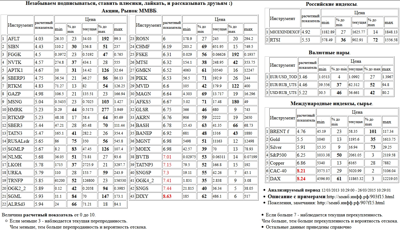 На 26/03/2015 10:27:02 при анализе акций рынка ценных бумаг ммвб, российских и международных индексов и валютных пар, сырья выявлено следующее - > Текущий анализ (архив, данные до 12.4.2016) - > Текущий анализ 26 Сильно перекуплены: Дикси а.о. ( DIXY ), Xetra DAX Index ( DAX ), Paris CAC-40 Index ( CAC-40 )