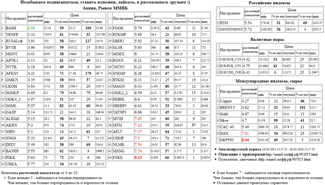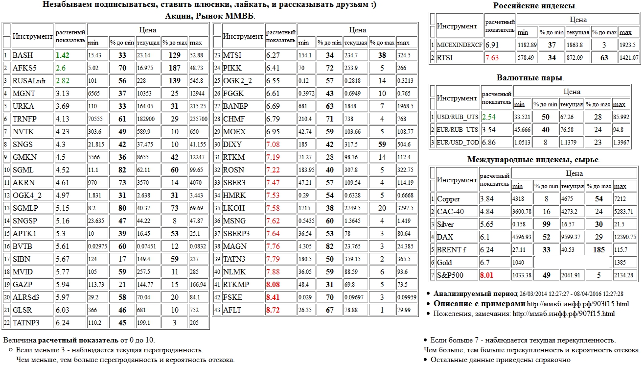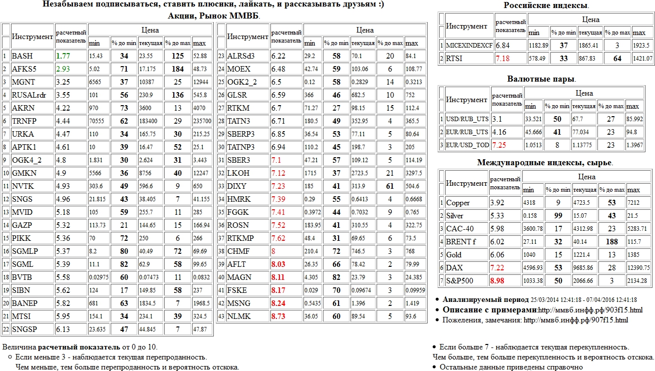 Сильно перепроданы: Распадская а.о. ( BASH ) Сильно перекуплены: Аэрофлот а.о. ( AFLT ), Северсталь а.о. ( CHMF ), ММК а.о. ( MAGN ), ФСК ЕЭС а.о. ( FSKE ), Мосэнерго а.о. ( MSNG ), НЛМК а.о. ( NLMK ), S&P 500 Index ( S&P500) - > Текущий анализ (архив, данные до 12.4.2016) - > Текущий анализ 500 На 07/04/2016 12:39:28 при анализе акций рынка ценных бумаг ммвб, российских и международных индексов и валютных пар, сырья выявлено следующее: