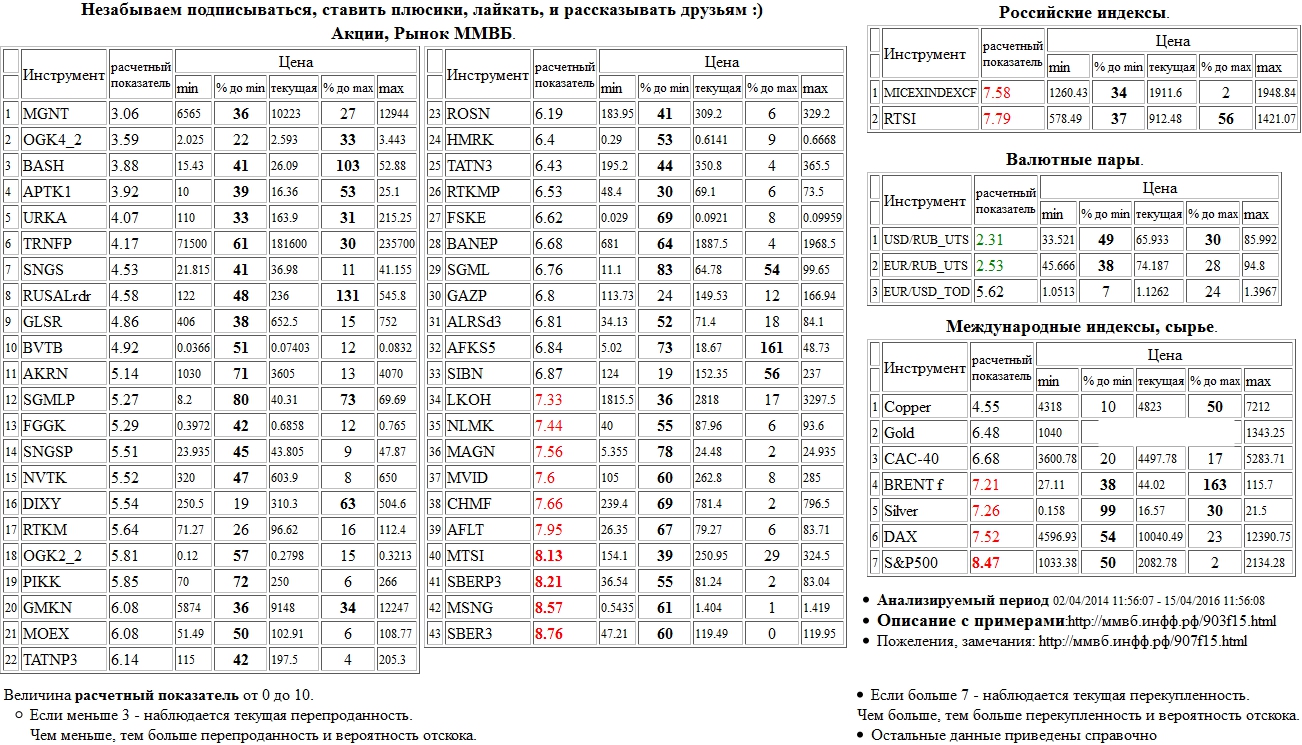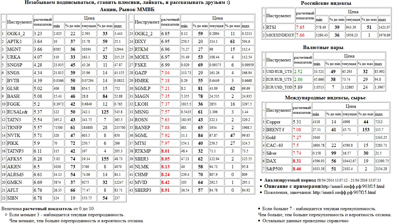 Сильно перекуплены: Сбербанк а.п. 3 в. ( SBERP3 ), АЛРОСА а.о. 3 в. ( ALRSd3 ), Газпром а.о. ( GAZP ), НЛМК а.о. ( NLMK ), ФСК ЕЭС а.о. ( FSKE ), МТС а.о. ( MTSI ), Моск. Биржа ММВБ-РТС а.о. ( MOEX ), М Видео а.о. ( MVID ), РТС, RTS, DAX, S&P500 - > Текущий анализ 500 На 20/04/2016 12:03:27 при анализе акций рынка ценных бумаг ммвб, российских и международных индексов и валютных пар, сырья выявлено следующее: