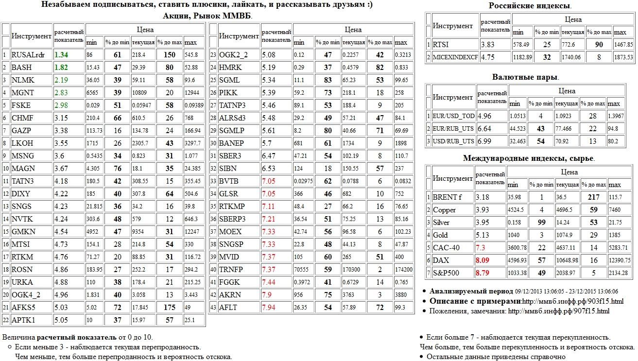 На 23/12/2015 13:04:13 при анализе акций рынка ценных бумаг ммвб, российских и международных индексов и валютных пар, сырья выявлено следующее - > Текущий анализ (архив, данные до 12.4.2016) - > Текущий анализ BVTB Сильно перепроданы: RUSAL РДР 1:10 ( RUSALrdr ), Распадская а.о. ( BASH )