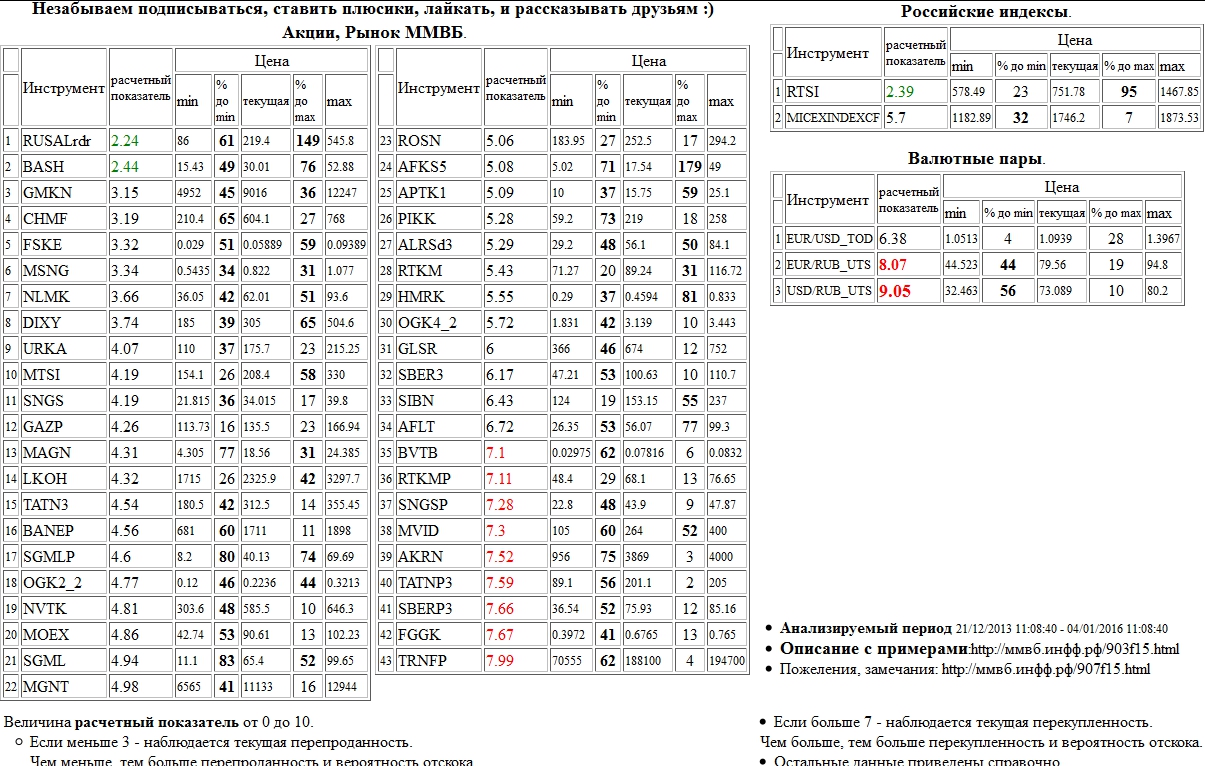 На 04/01/2016 11:07:09 при анализе акций рынка ценных бумаг ммвб, российских и валютных пар выявлено следующее - > Текущий анализ (архив, данные до 12.4.2016) - > Текущий анализ BVTB Очень сильно перекуплены: Доллар США/Рубль (UTS) ( USD/RUB_UTS )