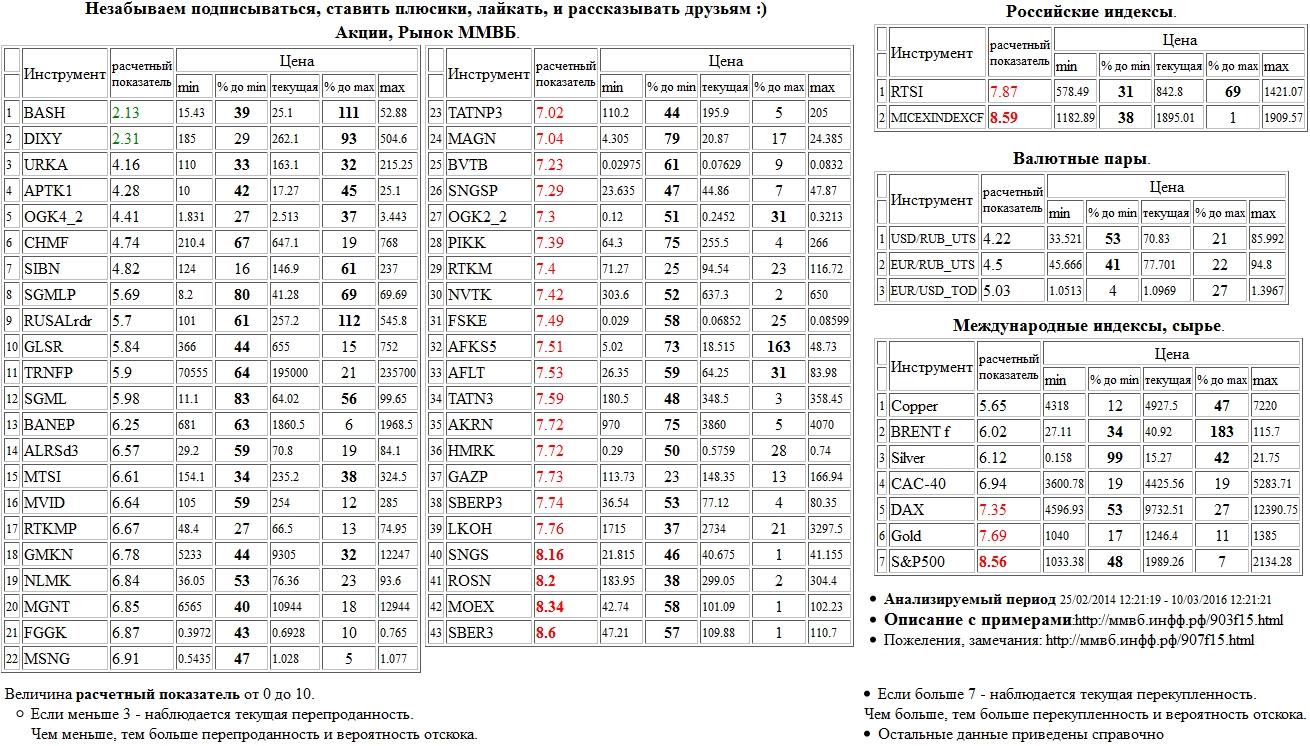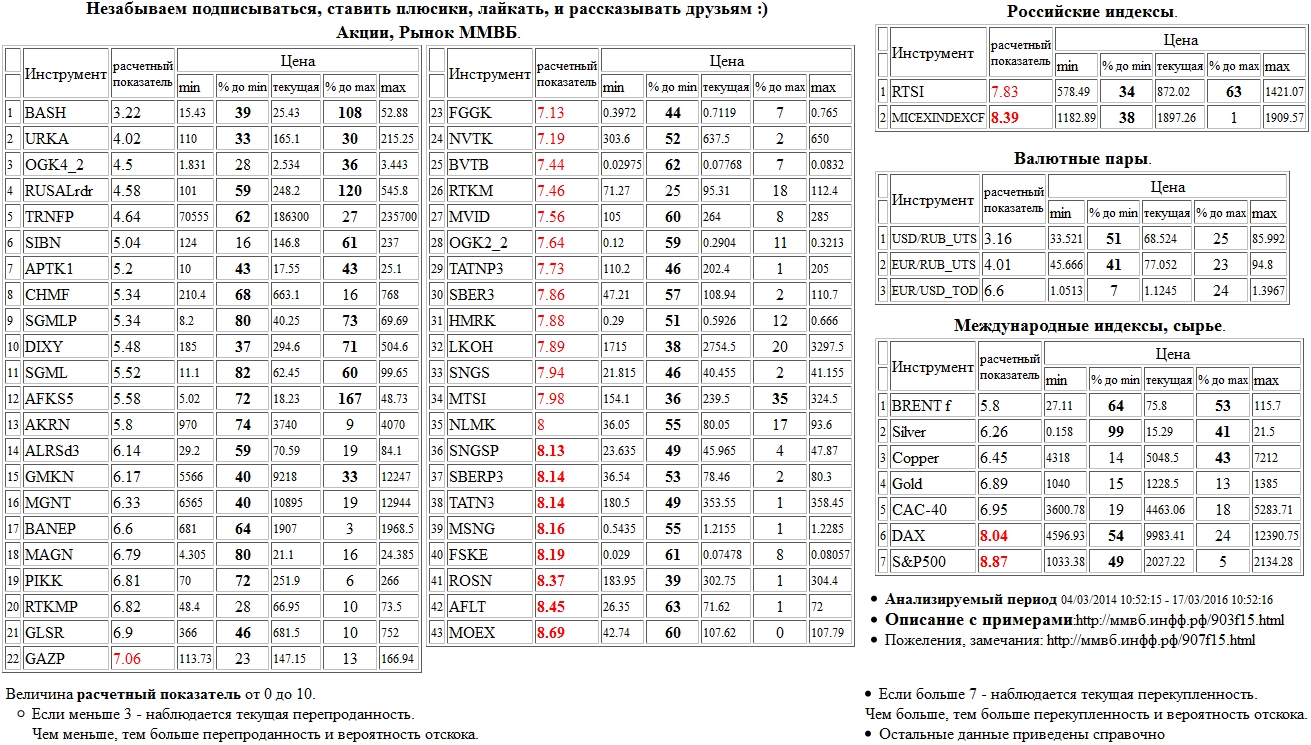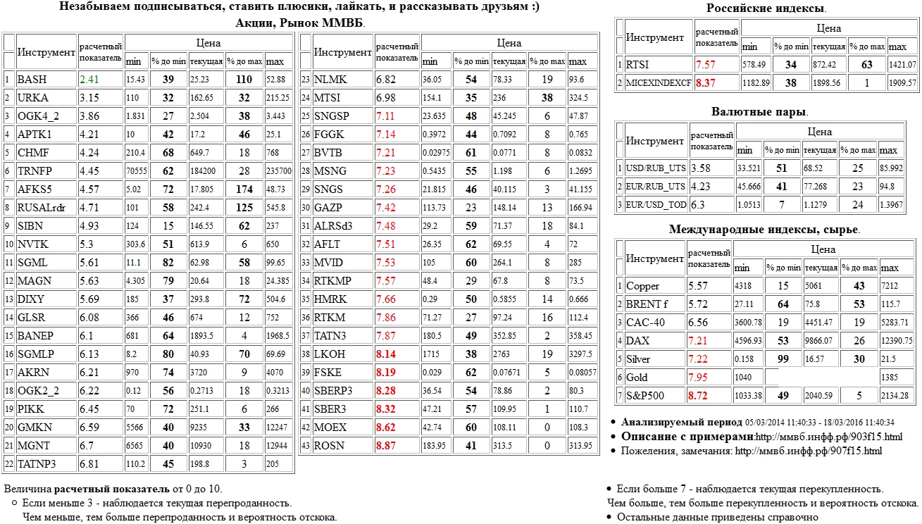На 17/03/2016 10:49:54 при анализе акций рынка ценных бумаг ммвб, российских и международных индексов и валютных пар, сырья выявлено следующее - > Текущий анализ (архив, данные до 12.4.2016) - > Текущий анализ BVTB Сильно перекуплены: НЛМК а.о. ( NLMK ), Татнефть а.о. 3 в. ( TATN3 ), Сбербанк а.п. 3 в. ( SBERP3 ), Сургутнефтегаз а.п. ( SNGSP ), Мосэнерго а.о. ( MSNG ), ФСК ЕЭС а.о. ( FSKE ), НК Роснефть а.о. ( ROSN ), Аэрофлот а.о. ( AFLT ), Моск. Биржа ММВБ-РТС а.о. ( MOEX ), ММВБ Индекс акций ( MICEXINDEXCF ), Xetra DAX Index ( DAX ), S&P 500 Index ( S&P500 )