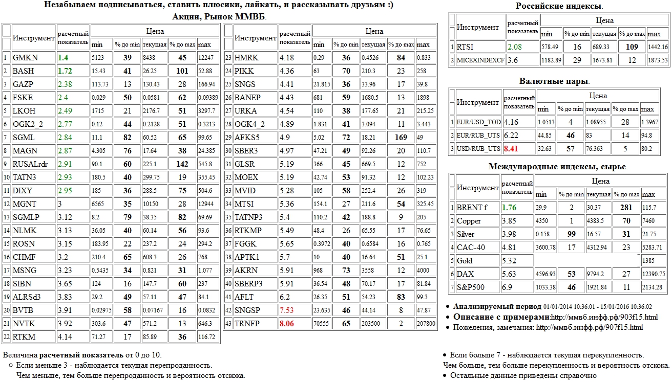 На 15/01/2016 10:34:12 при анализе акций рынка ценных бумаг ммвб, российских и международных индексов и валютных пар, сырья выявлено следующее - > Текущий анализ (архив, данные до 12.4.2016) - > Текущий анализ MGNT Сильно перепроданы: ГМК НорНикель а.о. ( GMKN ), Распадская а.о. ( BASH ), Brent f. ( BRENT f )