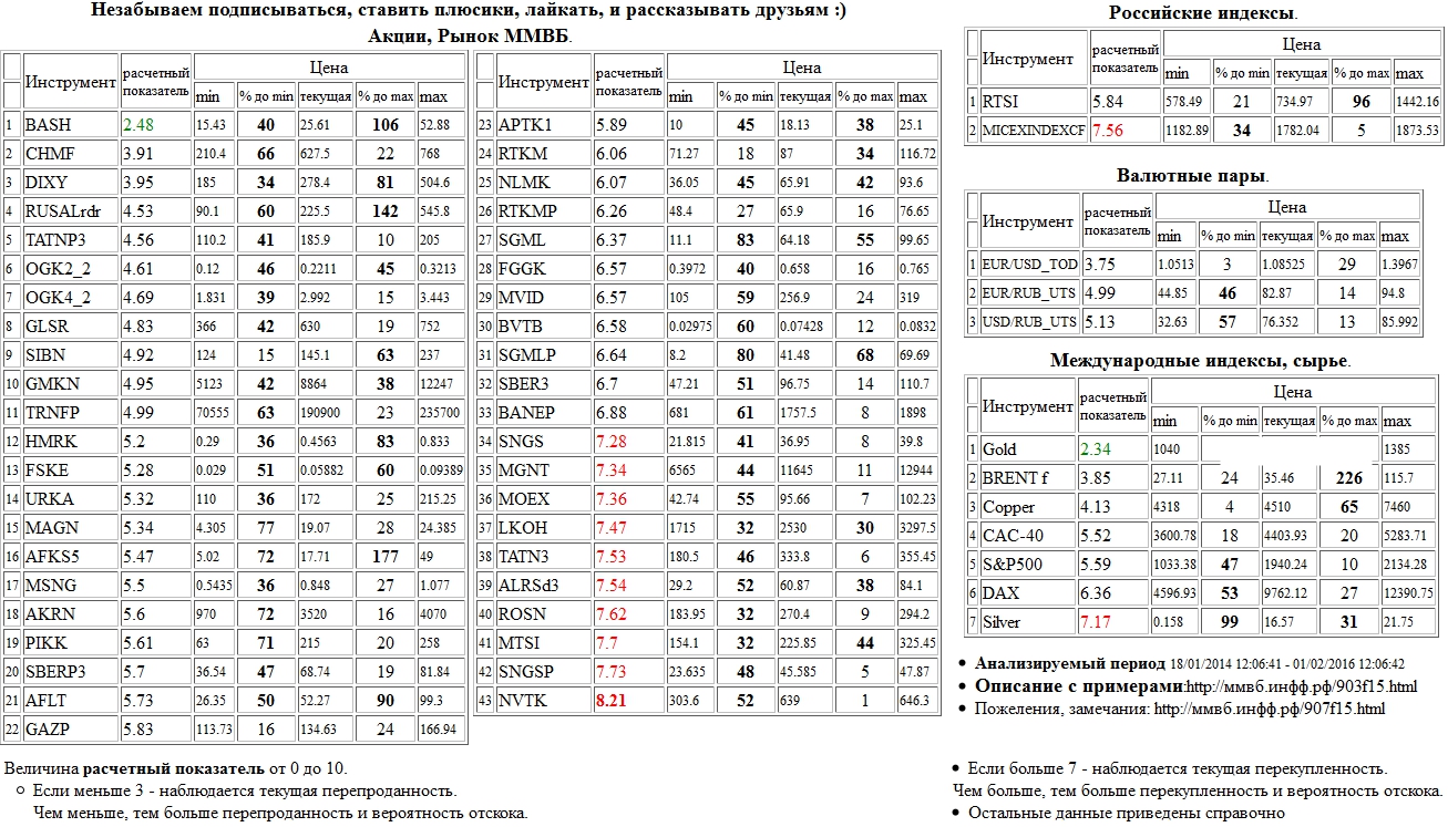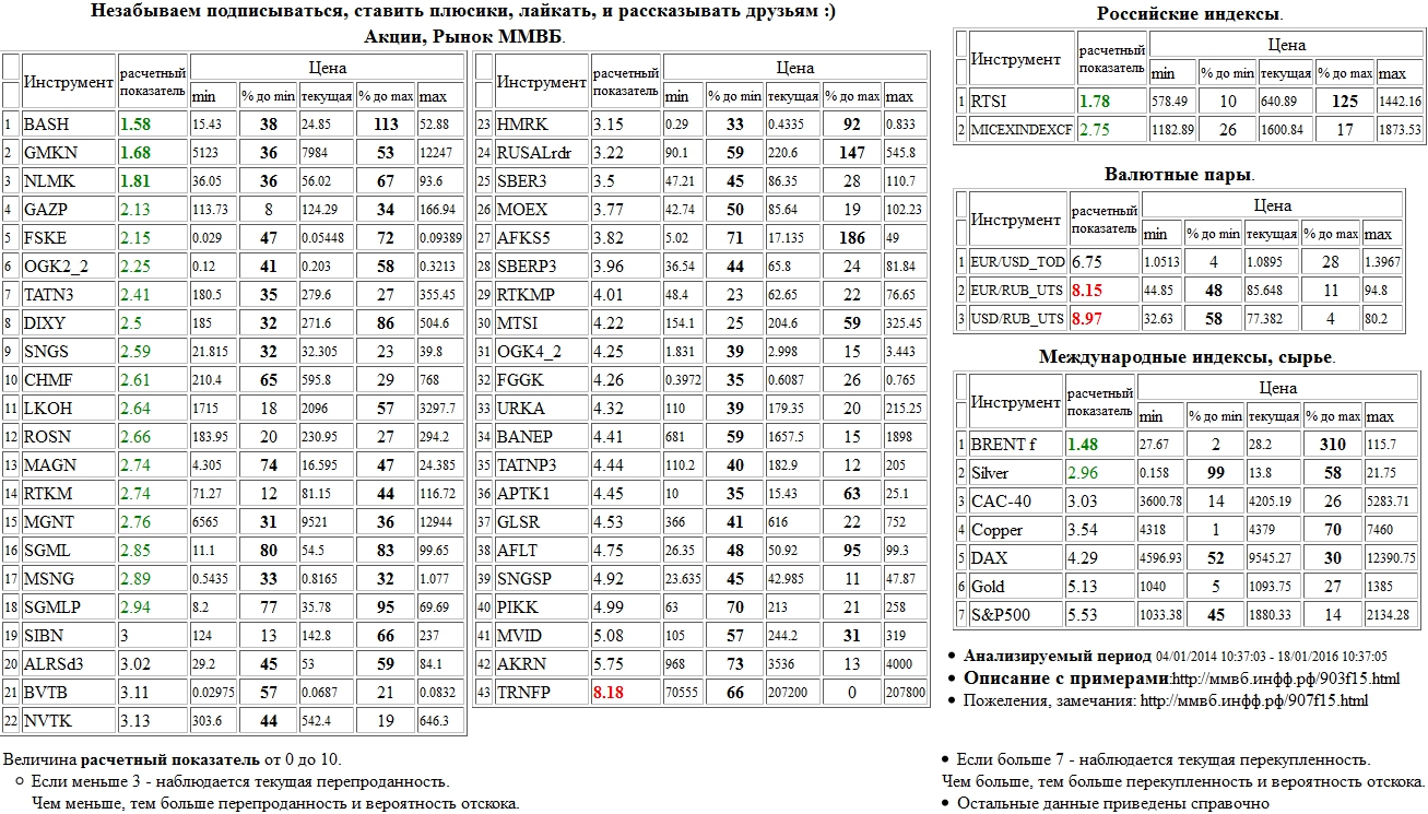 На 18/01/2016 10:35:05 при анализе акций рынка ценных бумаг ммвб, российских и международных индексов и валютных пар, сырья выявлено следующее - > Текущий анализ (архив, данные до 12.4.2016) - > Текущий анализ MGNT Сильно перепроданы: Распадская а.о. ( BASH ), ГМК НорНикель а.о. ( GMKN ), НЛМК а.о. ( NLMK ), РТС Индекс ( RTSI ), Brent f. ( BRENT f )