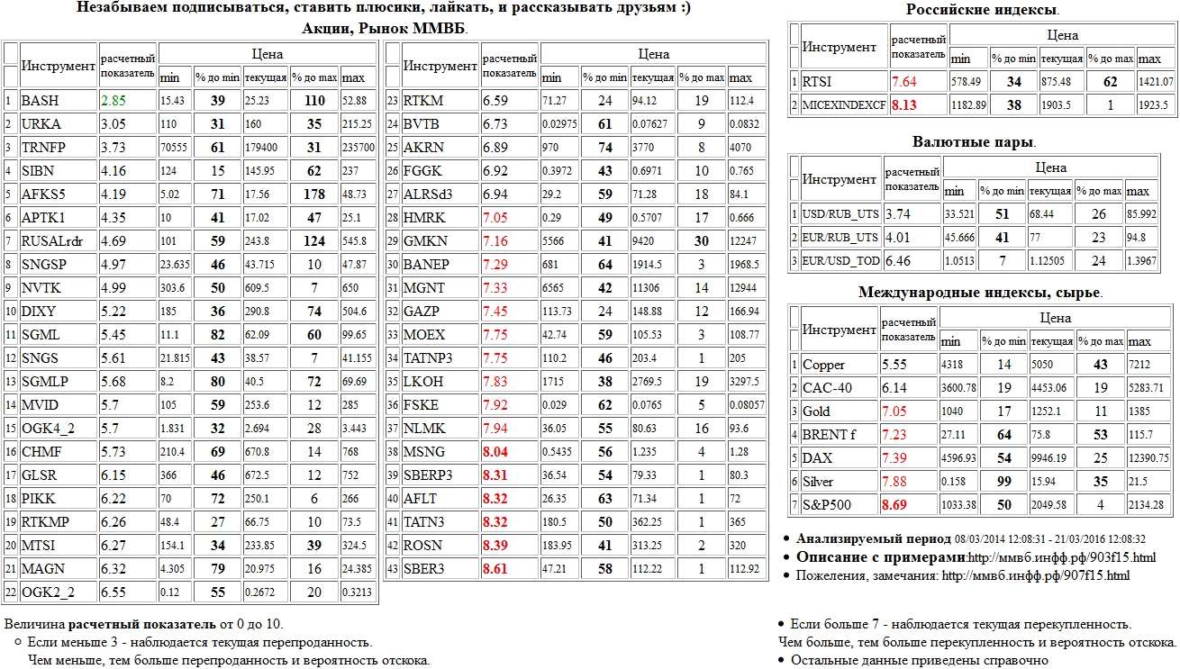 На 21/03/2016 12:06:43 при анализе акций рынка ценных бумаг ммвб, российских и международных индексов и валютных пар, сырья выявлено следующее - > Текущий анализ (архив, данные до 12.4.2016) - > Текущий анализ MGNT Сильно перекуплены: НЛМК а.о. ( NLMK ), Мосэнерго а.о. ( MSNG ), Сбербанк а.п. 3 в. ( SBERP3 ), Татнефть а.о. 3 в. ( TATN3 ), Аэрофлот а.о. ( AFLT ), НК Роснефть а.о. ( ROSN ), Сбербанк а.о. 3 в. ( SBER3 ), ММВБ Индекс акций ( MICEXINDEXCF ), S&P 500 Index ( S&P500 )