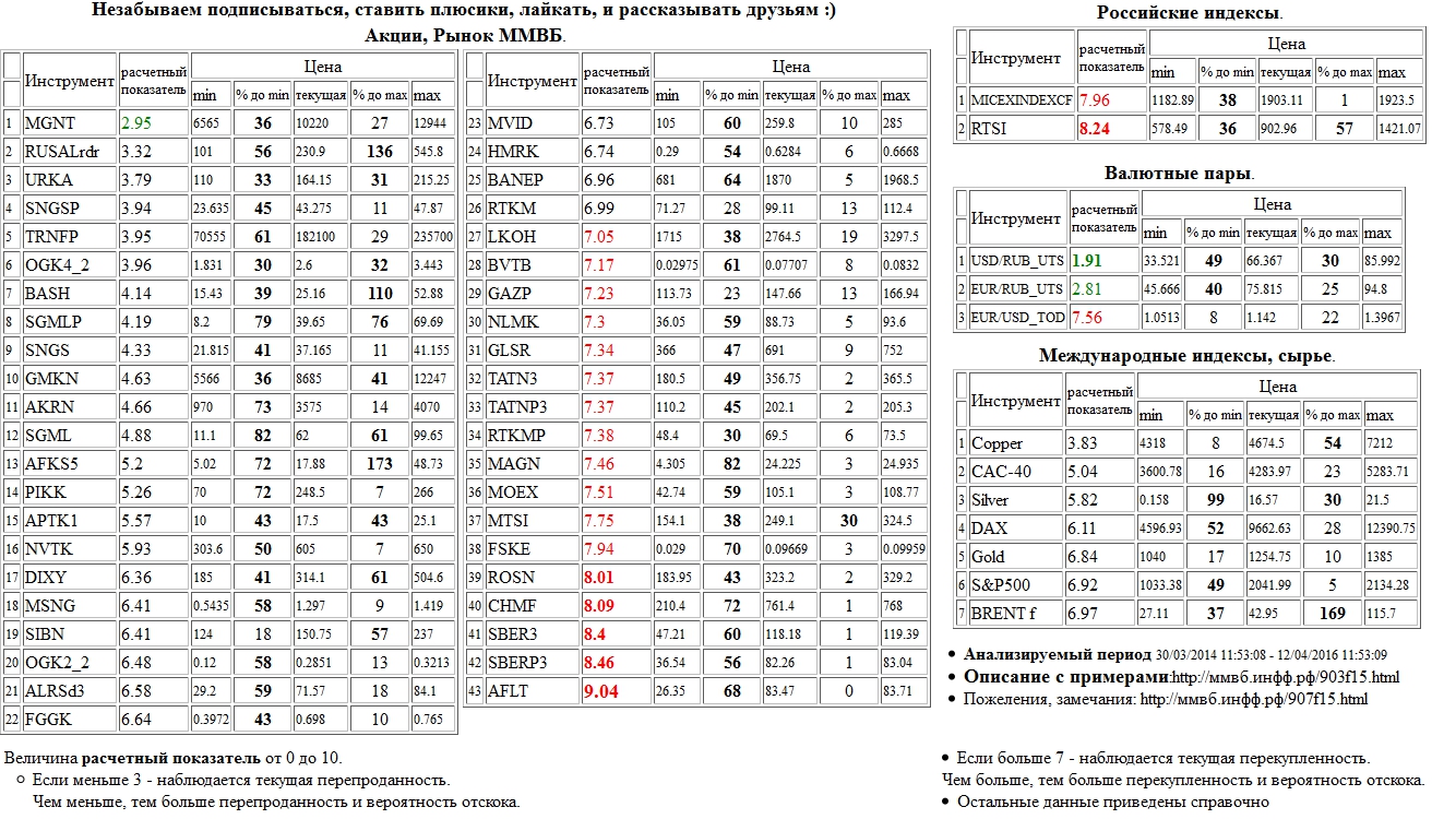 Сильно перекуплены: Сбербанк а.п. 3 в. ( SBERP3 ), АЛРОСА а.о. 3 в. ( ALRSd3 ), Газпром а.о. ( GAZP ), НЛМК а.о. ( NLMK ), ФСК ЕЭС а.о. ( FSKE ), МТС а.о. ( MTSI ), Моск. Биржа ММВБ-РТС а.о. ( MOEX ), М Видео а.о. ( MVID ), РТС, RTS, DAX, S&P500 - > Текущий анализ MGNT На 20/04/2016 12:03:27 при анализе акций рынка ценных бумаг ммвб, российских и международных индексов и валютных пар, сырья выявлено следующее: