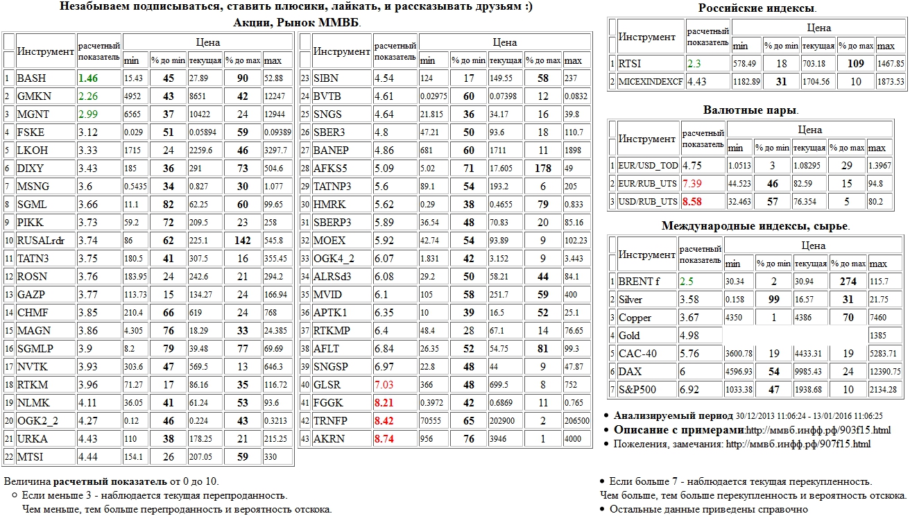 На 15/01/2016 10:34:12 при анализе акций рынка ценных бумаг ммвб, российских и международных индексов и валютных пар, сырья выявлено следующее - > Текущий анализ (архив, данные до 12.4.2016) - > Текущий анализ TRNFP Сильно перепроданы: ГМК НорНикель а.о. ( GMKN ), Распадская а.о. ( BASH ), Brent f. ( BRENT f )