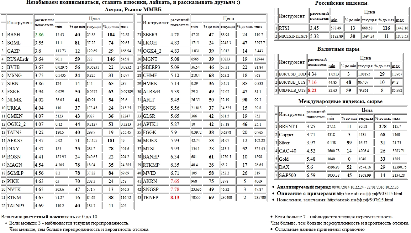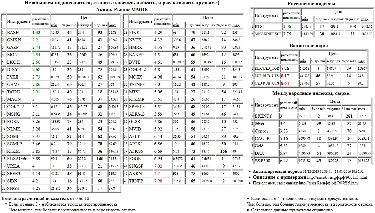 На 14/01/2016 10:35:20 при анализе акций рынка ценных бумаг ммвб, российских и международных индексов и валютных пар, сырья выявлено следующее - > Текущий анализ (архив, данные до 12.4.2016) - > Текущий анализ TRNFP Сильно перепроданы: Распадская а.о. ( BASH )