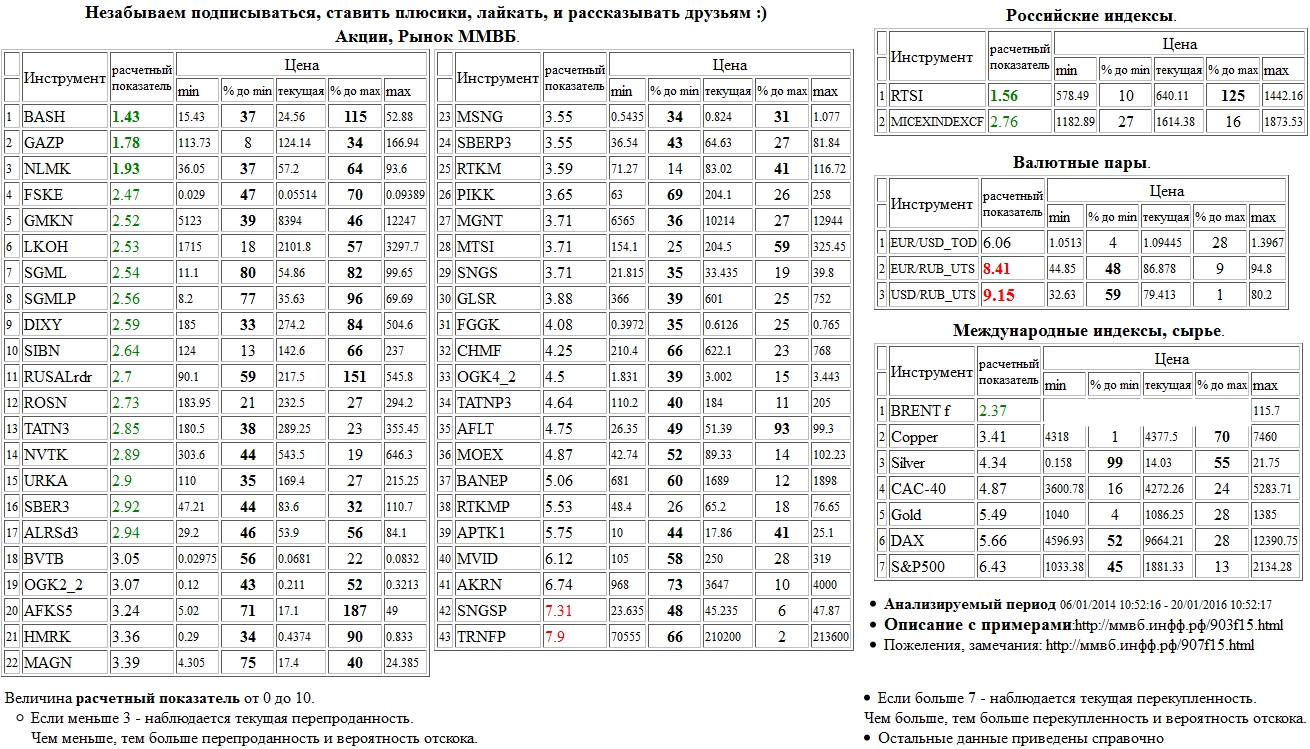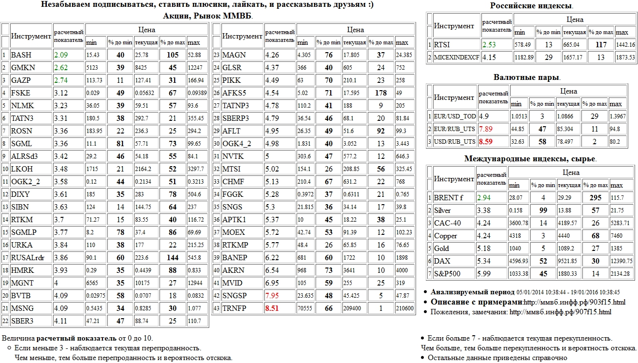 На 20/01/2016 10:50:08 при анализе акций рынка ценных бумаг ммвб, российских и международных индексов и валютных пар, сырья выявлено следующее - > Текущий анализ (архив, данные до 12.4.2016) - > Текущий анализ TRNFP Очень сильно перекуплены: Доллар США/Рубль (UTS) ( USD/RUB_UTS )