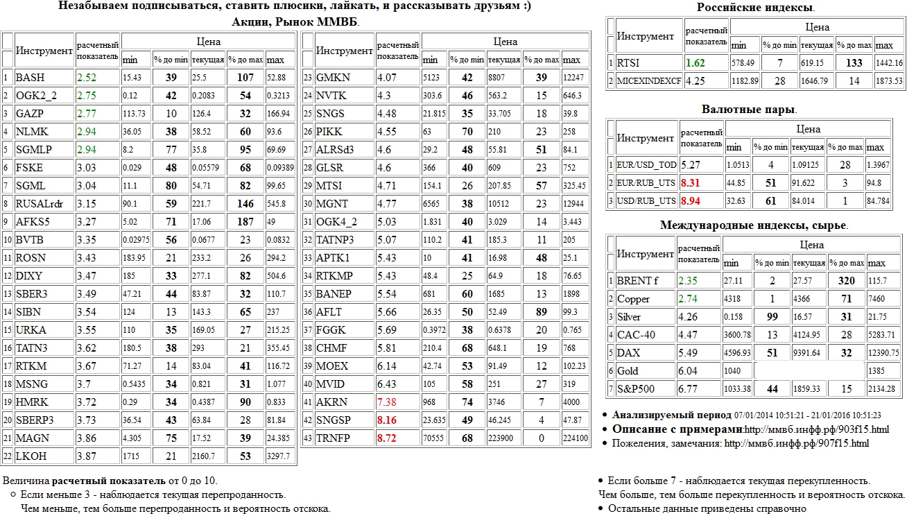 На 18/01/2016 10:35:05 при анализе акций рынка ценных бумаг ммвб, российских и международных индексов и валютных пар, сырья выявлено следующее - > Текущий анализ (архив, данные до 12.4.2016) - > Текущий анализ TRNFP Сильно перепроданы: Распадская а.о. ( BASH ), ГМК НорНикель а.о. ( GMKN ), НЛМК а.о. ( NLMK ), РТС Индекс ( RTSI ), Brent f. ( BRENT f )