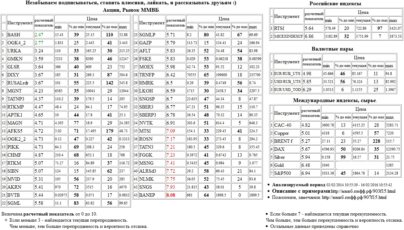 На 22/02/2016 11:06:27 при анализе акций рынка ценных бумаг ммвб, российских и международных индексов и валютных пар, сырья выявлено следующее - > Текущий анализ (архив, данные до 12.4.2016) - > Текущий анализ fggk Сильно перекуплены: РусГидро а.о. ( FGGK )