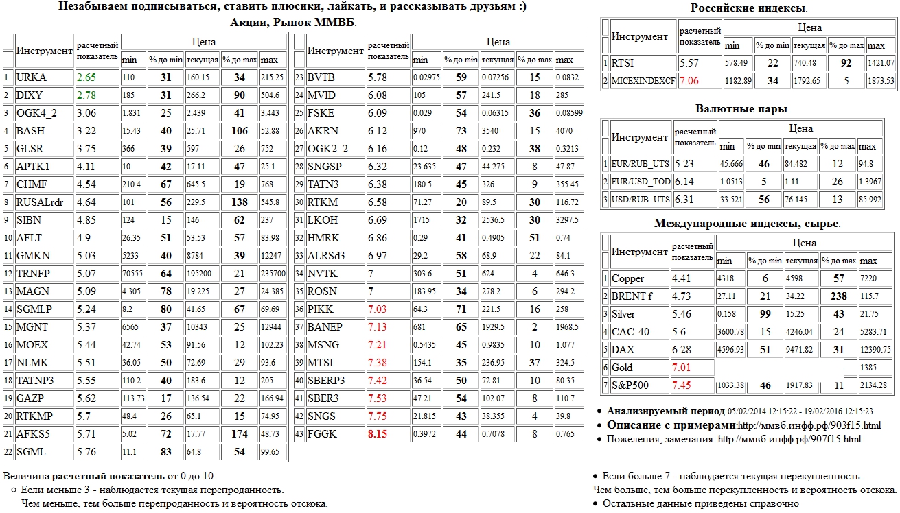 На 19/02/2016 12:13:38 при анализе акций рынка ценных бумаг ммвб, российских и международных индексов и валютных пар, сырья выявлено следующее - > Текущий анализ (архив, данные до 12.4.2016) - > Текущий анализ fggk Сильно перекуплены: РусГидро а.о. ( FGGK )
