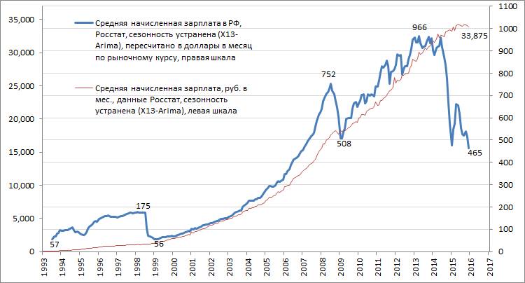 Динамика средней начисленной зарплаты в РФ в пересчете в USD с 1993 по 2016 - > Россия - > К размышлению usd Средняя начисленная зарплата в РФ, Росстат, сезонность устранена (X13-Arima), пересчитано в доллары в месяц по рыночному курсу, правая шкала