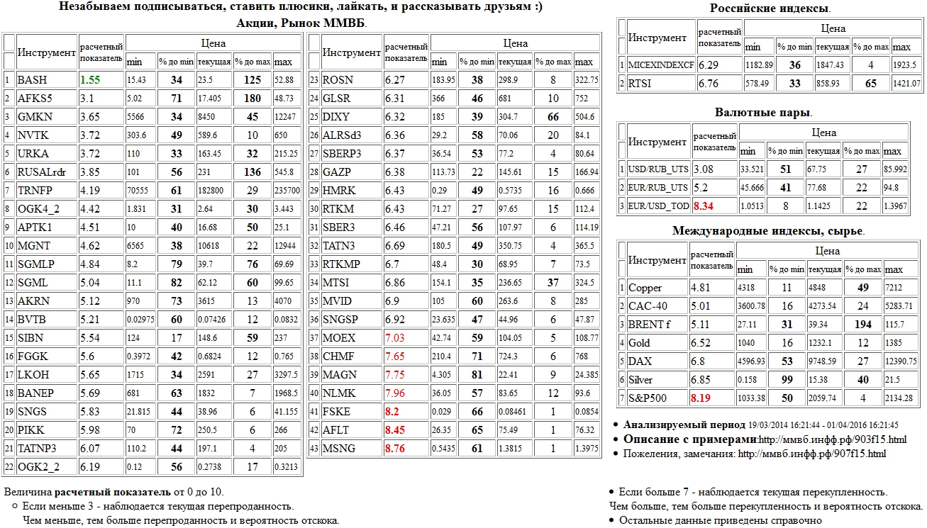 Очень сильно перекуплены: Аэрофлот а.о. ( AFLT ) Сильно перепроданы: Доллар США/Рубль (UTS) ( USD/RUB_UTS ) Сильно перекуплены: Сбербанк а.о. 3 в. ( SBER3 ), Сбербанк а.п. 3 в. ( SBERP3 ), РТС Индекс ( RTSI ) - > Текущий анализ usd На 12/04/2016 11:51:11 при анализе акций рынка ценных бумаг ммвб, российских и международных индексов и валютных пар, сырья выявлено следующее: