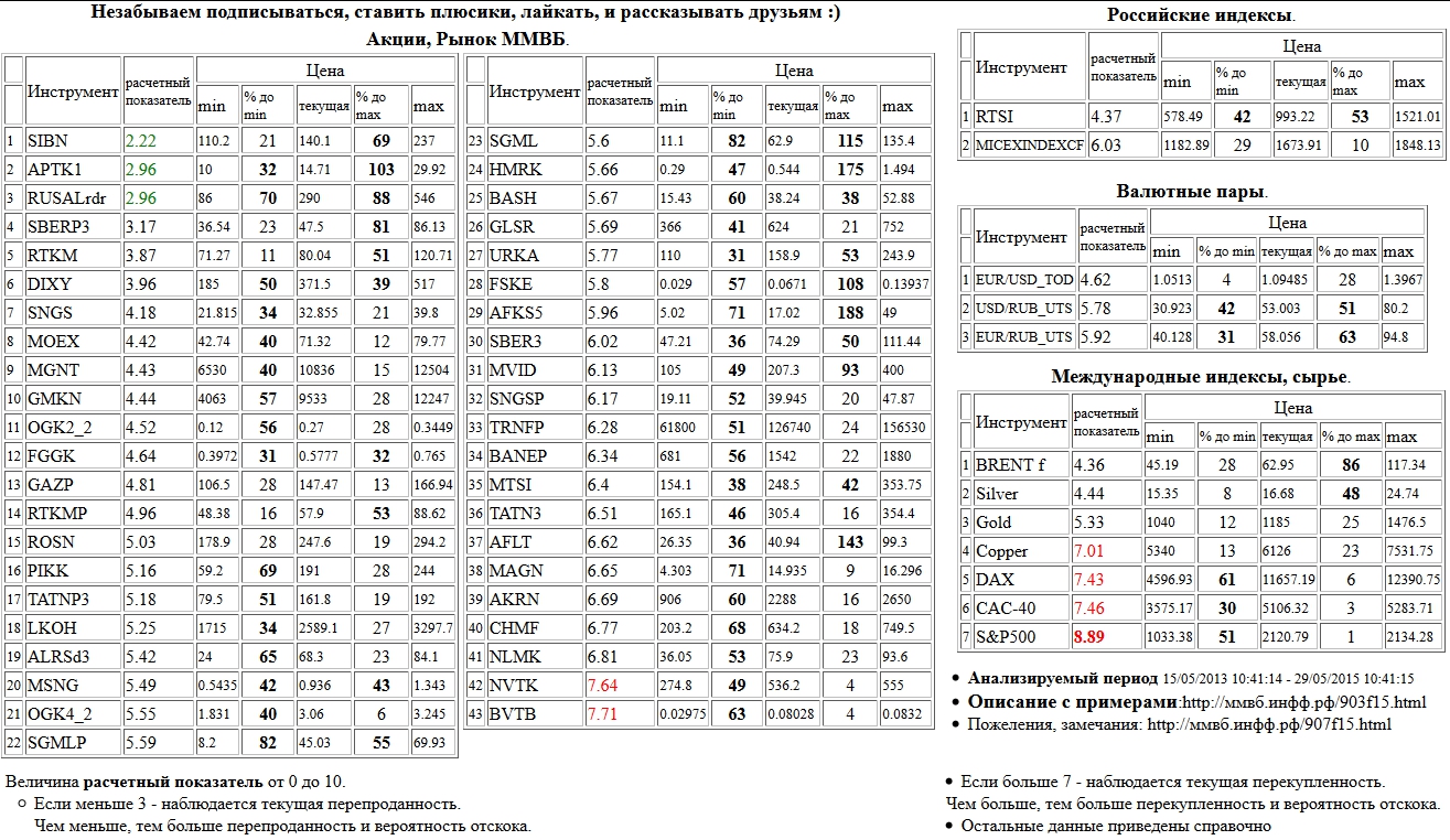 На 17/03/2016 10:49:54 при анализе акций рынка ценных бумаг ммвб, российских и международных индексов и валютных пар, сырья выявлено следующее - > Текущий анализ (архив, данные до 12.4.2016) - > Текущий анализ огк Сильно перекуплены: НЛМК а.о. ( NLMK ), Татнефть а.о. 3 в. ( TATN3 ), Сбербанк а.п. 3 в. ( SBERP3 ), Сургутнефтегаз а.п. ( SNGSP ), Мосэнерго а.о. ( MSNG ), ФСК ЕЭС а.о. ( FSKE ), НК Роснефть а.о. ( ROSN ), Аэрофлот а.о. ( AFLT ), Моск. Биржа ММВБ-РТС а.о. ( MOEX ), ММВБ Индекс акций ( MICEXINDEXCF ), Xetra DAX Index ( DAX ), S&P 500 Index ( S&P500 )